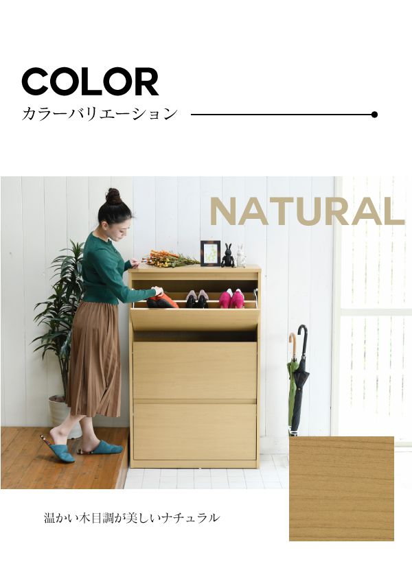 玄関の限られたスペースでも場所を取らない薄型設計のシューズボックス。扉がフラップ仕様になっており、玄関にあふれた靴をすっきり収納できて見た目もスタイリッシュ。ワイドタイプは高さが123cmと低めなので、写真や雑貨をディスプレイしたり出かける際に持ち歩く鍵や定期入れなどを置いたりするのにもぴったりです。