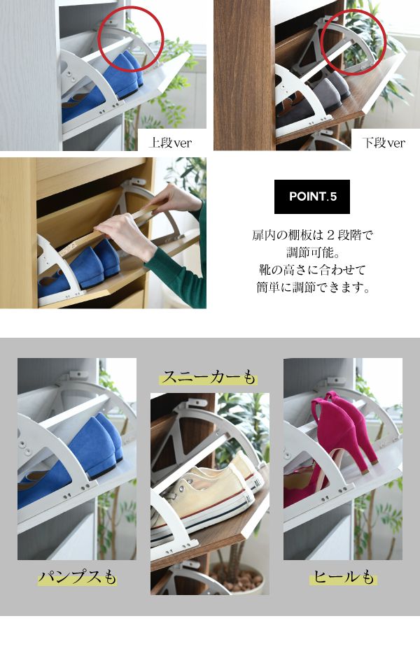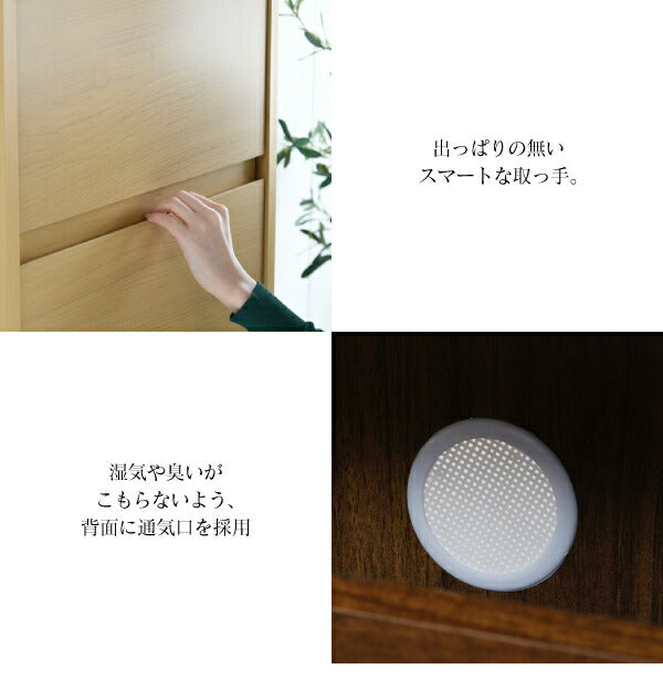 玄関の限られたスペースでも場所を取らない薄型設計のシューズボックス。扉がフラップ仕様になっており、玄関にあふれた靴をすっきり収納できて見た目もスタイリッシュ。スリムタイプは幅50cm以下と省スペースながら、縦の空間を有効活用することでたっぷり収納できます