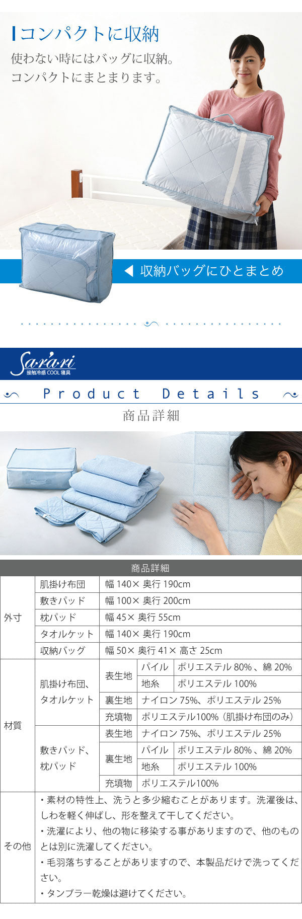 接触冷感 ひんやり寝具6点セット 肌掛け布団 タオルケット 敷きパッド 枕パッド 収納バッグ ひんやりケット ひんやりシーツ 抗菌防臭 洗える 布団セット 夏 寝具(代引不可)