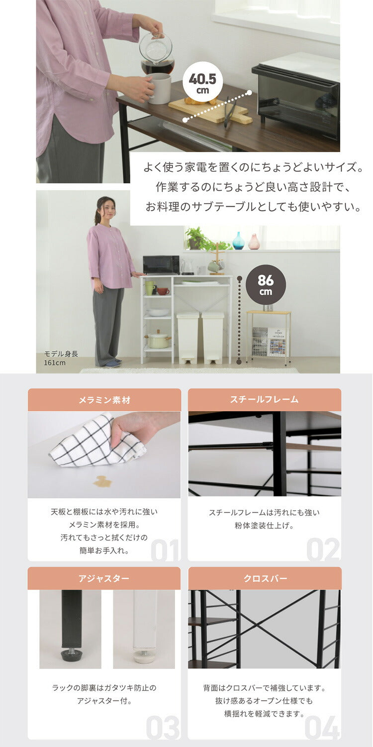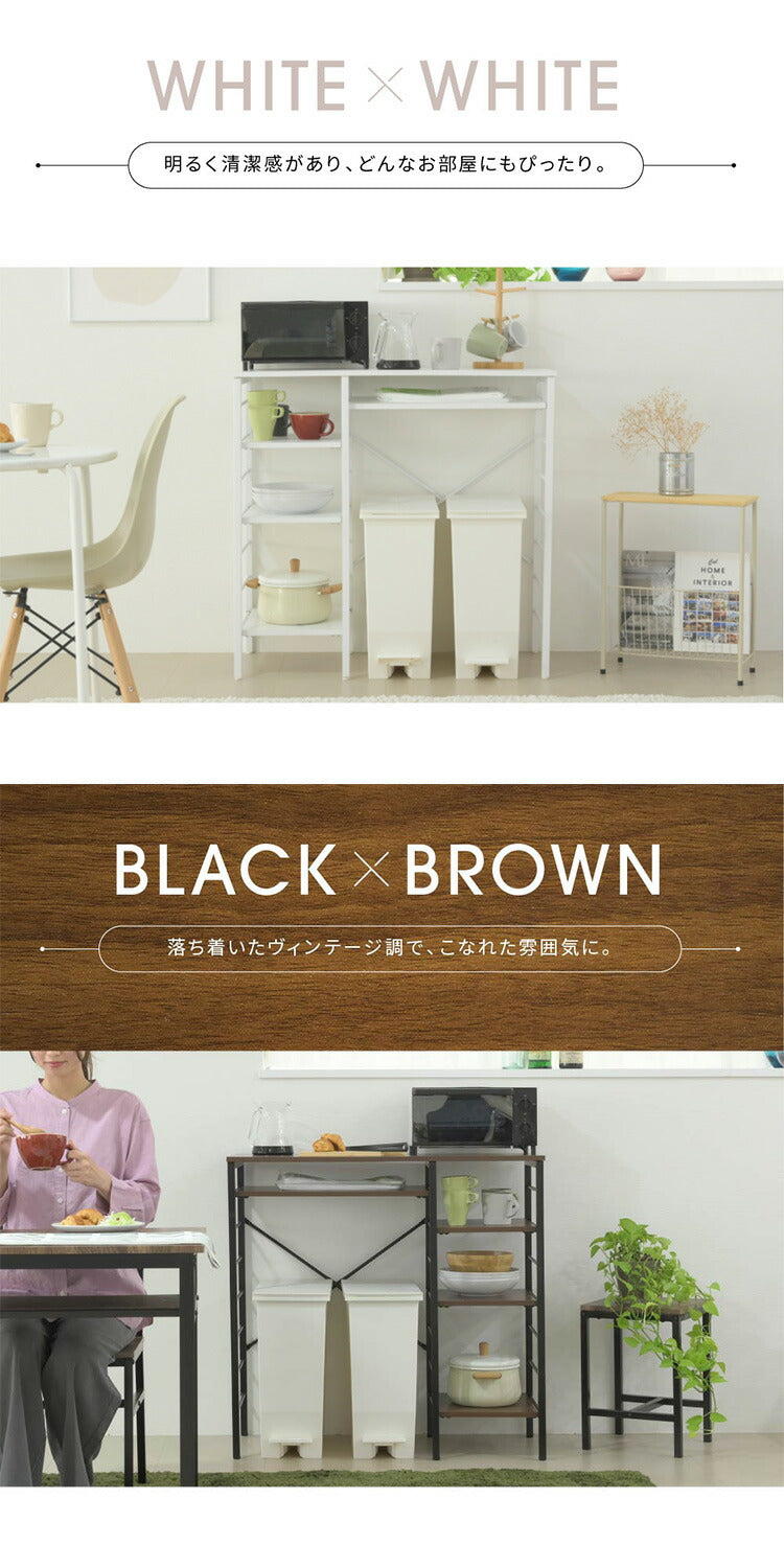 幅90cmの広々作業スペースとゴミ箱収納ができるキッチンカウンター。奥行き40cmなので、大きめの電子レンジなど置くこともできます。サイドの収納スペースは可動棚なので、収納するものに合わせて高さ調整が可能なラック。サイドフレームにはS字フックなどを使うことで、ちょこっと掛けにご活用いただけます。