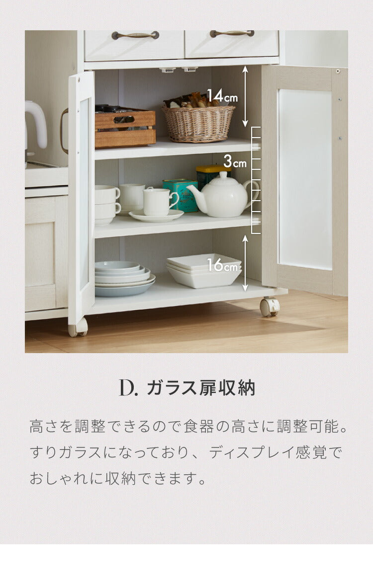 ・奥行き40cmのすっきり設計でありながら、いろんなキッチン用品がしまえる、これ一台あれば収納に困らない商品です。