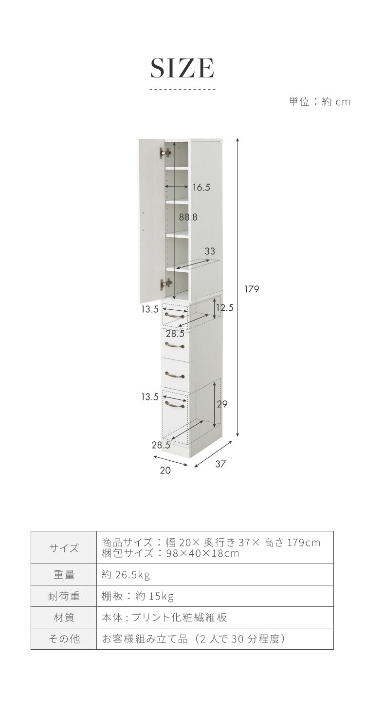 すき間収納 幅20cm スリム 食器棚 隙間収納 ラック コンパクト キャビネット ハイタイプ キッチン収納 引き出し シンプル キッチン 収納