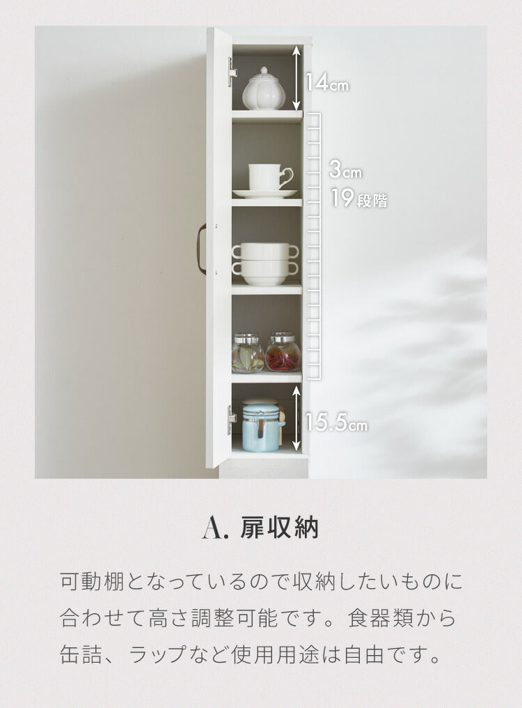 ・扉部分は可動棚となっており、収納したいものに合わせて高さ調整可能です。