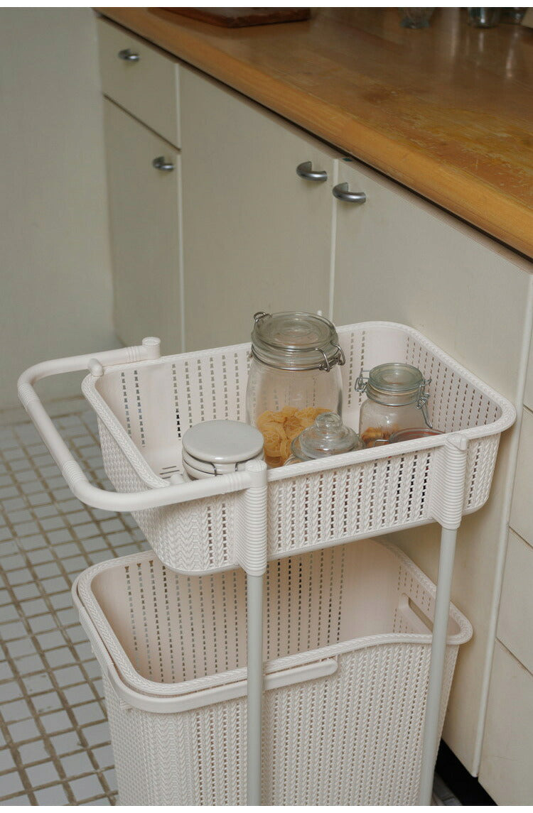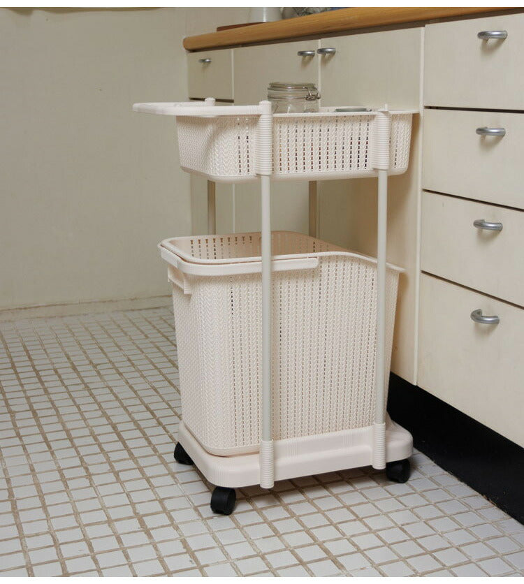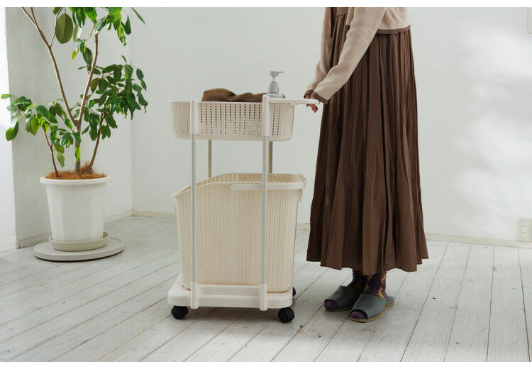 ラタン調 ランドリーバスケット 樹脂製 2段 キャスター付き ニット調 ランドリーラック ワゴン ランドリー収納 サニタリー収納 脱衣所 洗面所 リビング(代引不可)