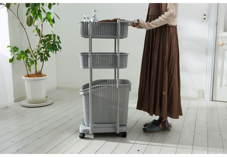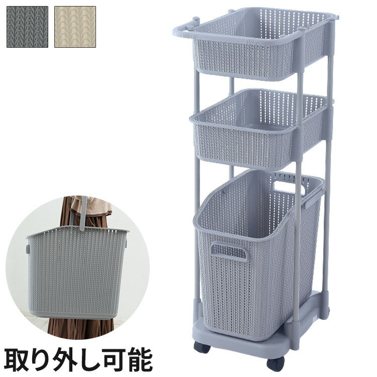 ラタン調 ランドリーバスケット 樹脂製 3段 浅型 キャスター付き ニット調 ランドリーラック ワゴン ランドリー収納 サニタリー収納 脱衣所 洗面所 リビング(代引不可)