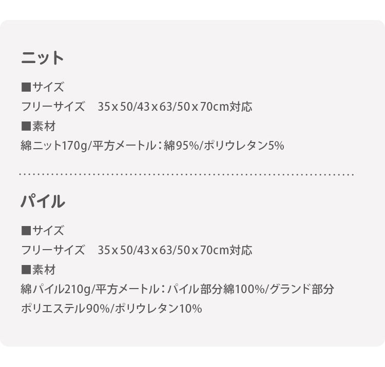 素材:綿パイル210g/平方メートル:パイル部分綿100%/グランド部分ポリエステル90%/ポリウレタン10%