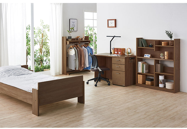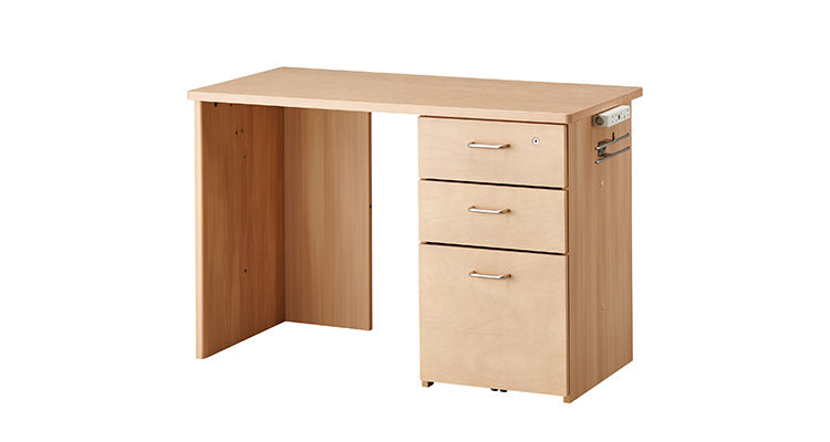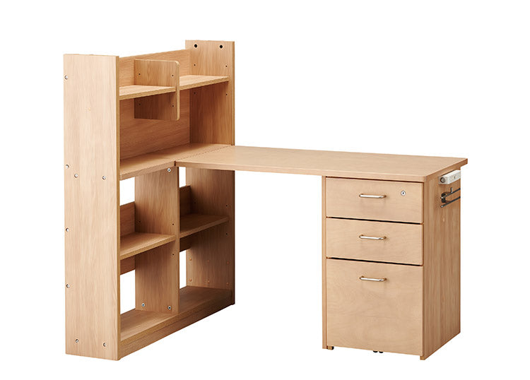 デスクのどちらかの方側板を外し(ワゴン側面に収納)、シェルフと連結することでユニットデスクスタイルにできます