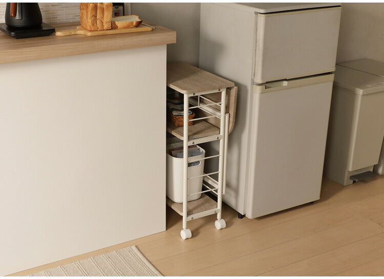 広げたときは天板サイズ500×450mmで、使わないときは幅270mmに折り畳んでスリムに収納できます。