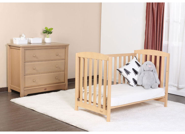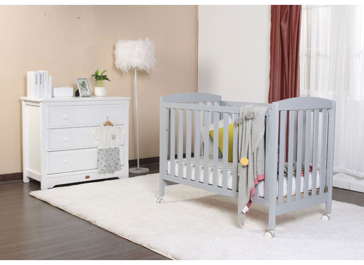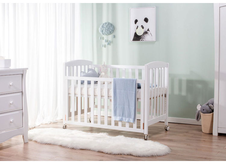 Boori独自のスライド式前柵により、ベッド内の作業が行いやすくなっています。またベッドを動かすときに便利なキャスターが付いており、置く場所を選ばないながらも存在感のあるベビーベッドです。
