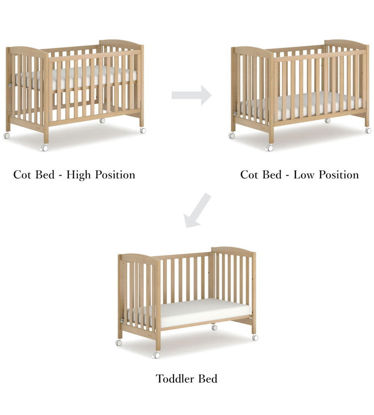 床板の高さは6段階で調節が可能です。これにより、自分に合った高さで赤ちゃんのお世話をすることができます。成長に合わせてベッドを組み替えることで、より長く家具として使うことが可能。カラーはアーモンド・ホワイトに、新色のライトグレーが加わりました。