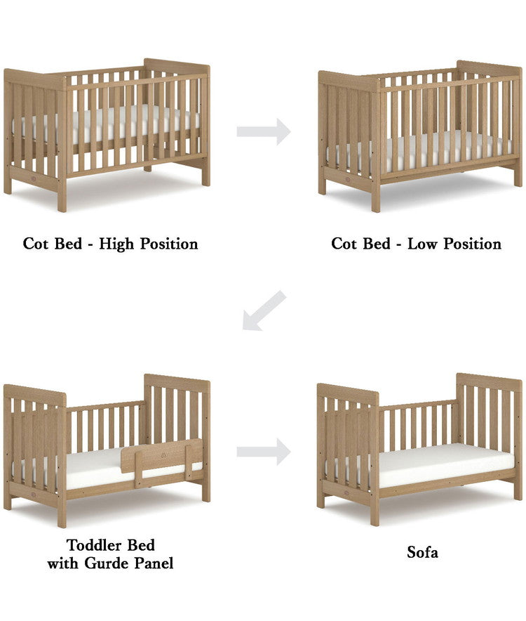 前柵はBoori独自開発のスライド式前柵で、片手でも開閉操作することができます。床板の高さは二段階調整。新生児から最上段で使い始め、掴まり立ちをする頃に最下段へ組み替えます。その後は2歳頃から前柵を取り外してキッズベッドとしてお使いいただくことが可能です。キッズベッドとして使った後は、そのままソファとしてもお使いいただけます。