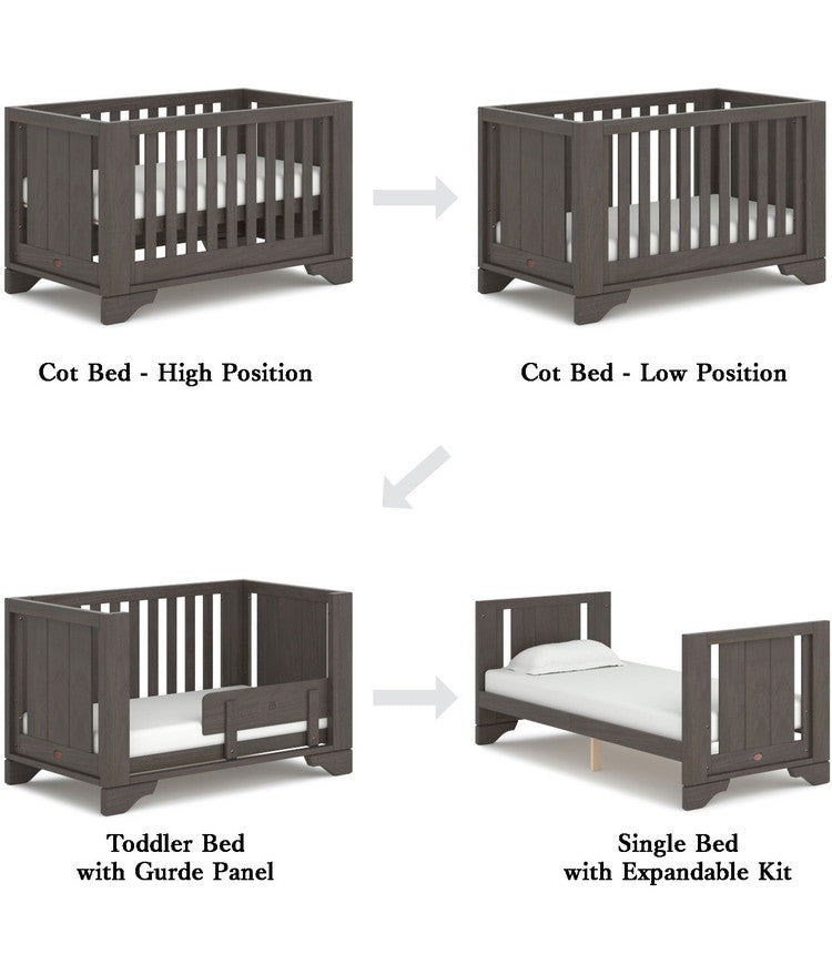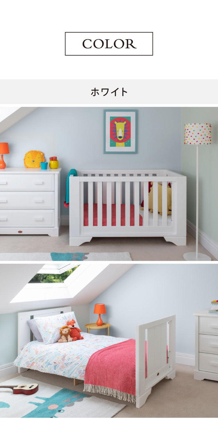 床板の高さは二段階調整。新生児から最上段で使い始め、掴まり立ちをする頃に最下段へ組み替えます。2歳頃から前柵を取り外してキッズベッドとしてお使いいただき、その後は専用の拡張キットを付けることでシングルベッドに形を変えることが可能です。お子様の成長に寄り添う家具になっています。