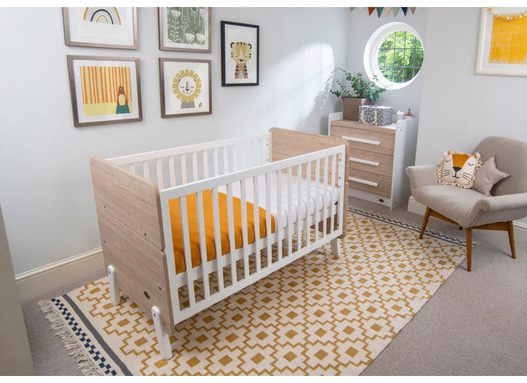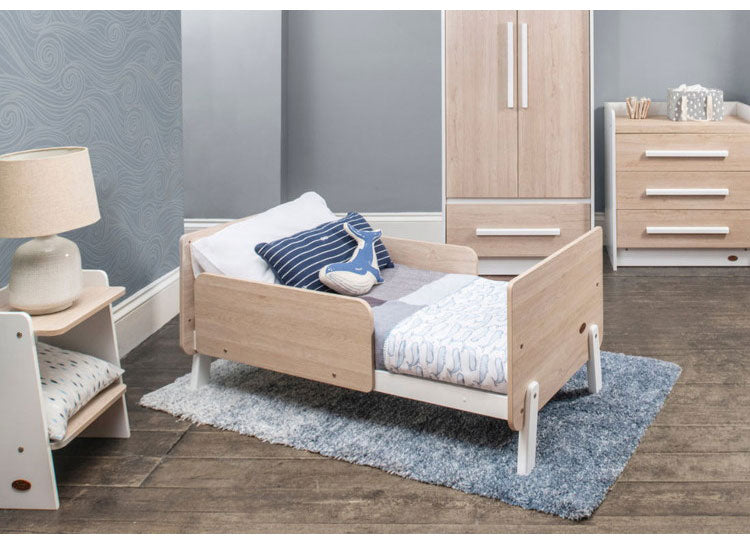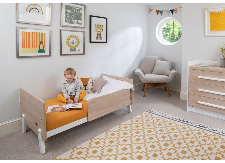 床板の高さは二段階調整。新生児から最上段で使い始め、掴まり立ちをする頃に最下段へ組み替えます。その後は2歳頃から前後柵・妻枠上部を取り外し、妻枠上部を床板に取り付けることでよりキッズベッドらしくお使いいただけます。成長に合わせてベッドを組み替えることで、より長く家具として使うことが可能です。カラーはスカンディナヴィアスタイルなホワイトオークで、流行のインテリアによくあうデザインです。