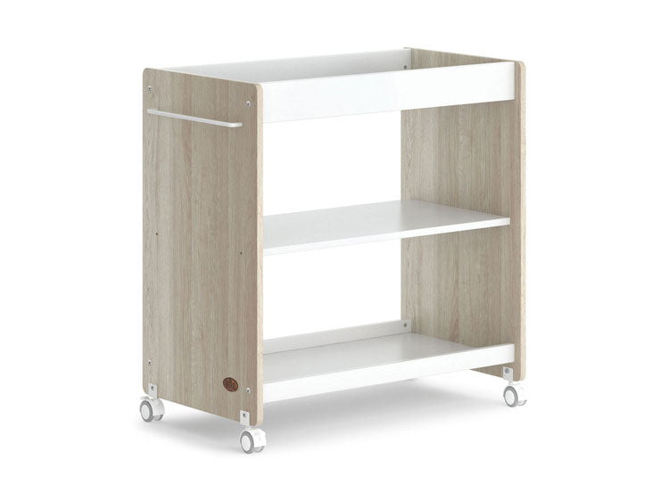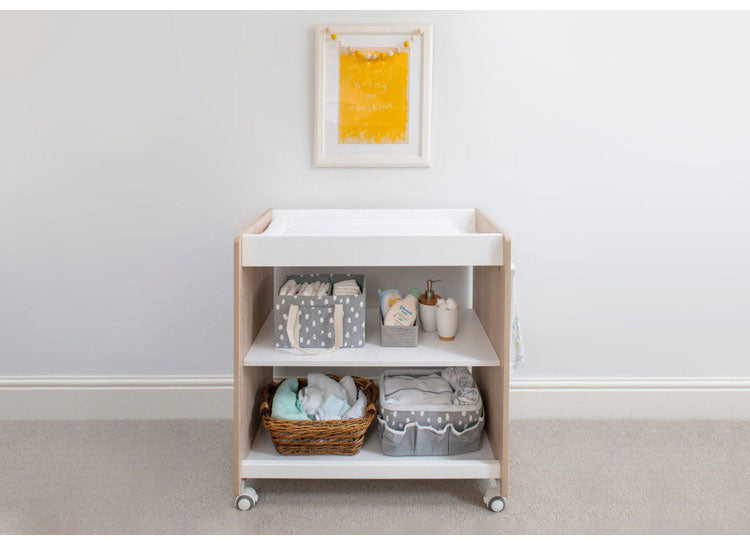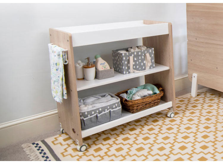 おむつ交換台として使用した後は、ワゴンやラックとして家族の生活に寄り添います。カラーはホワイトオークで、北欧風なインテリアに合わせやすいデザインです。
