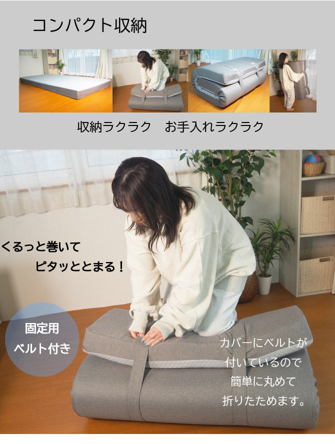 カバーにベルトが付いているので簡単に丸めて折りたためます。