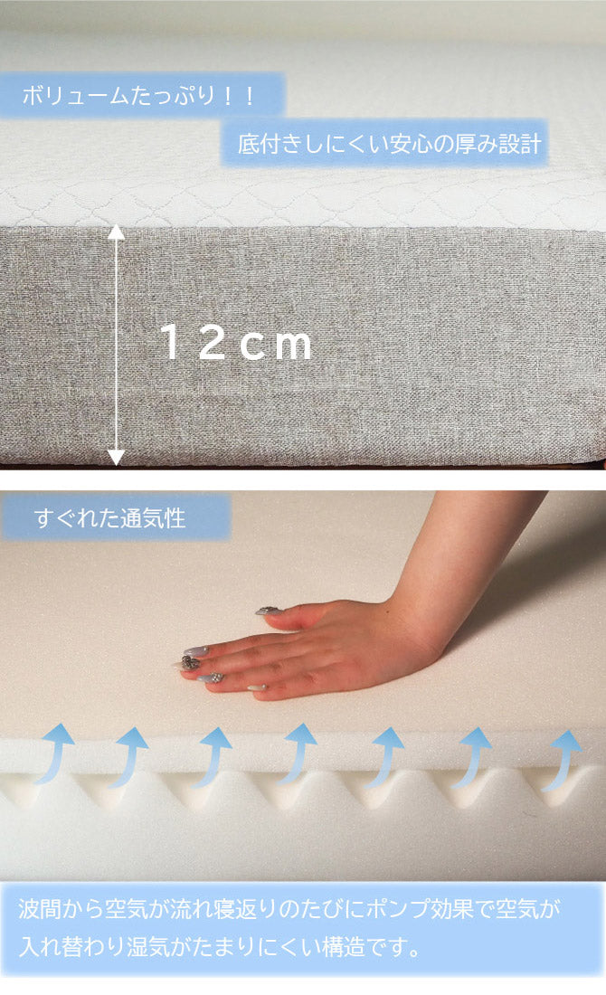 優れた通気性。波間から空気が流れ寝返りのたびにポンプ効果で空気が入れ替わり湿気がたまりにくい構造です。