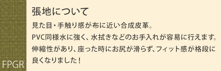 座面張り込みの合成皮革は、見た目・手触り感が布に近いFP張地。
