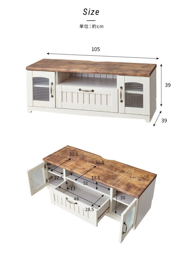 カントリー TV台 テレビ台 幅105cm かわいい アンティーク レトロ風 おしゃれ テレビボード ローボード TVボード フレンチ 木目調 木製 収納 扉付き ガラス扉(代引不可)