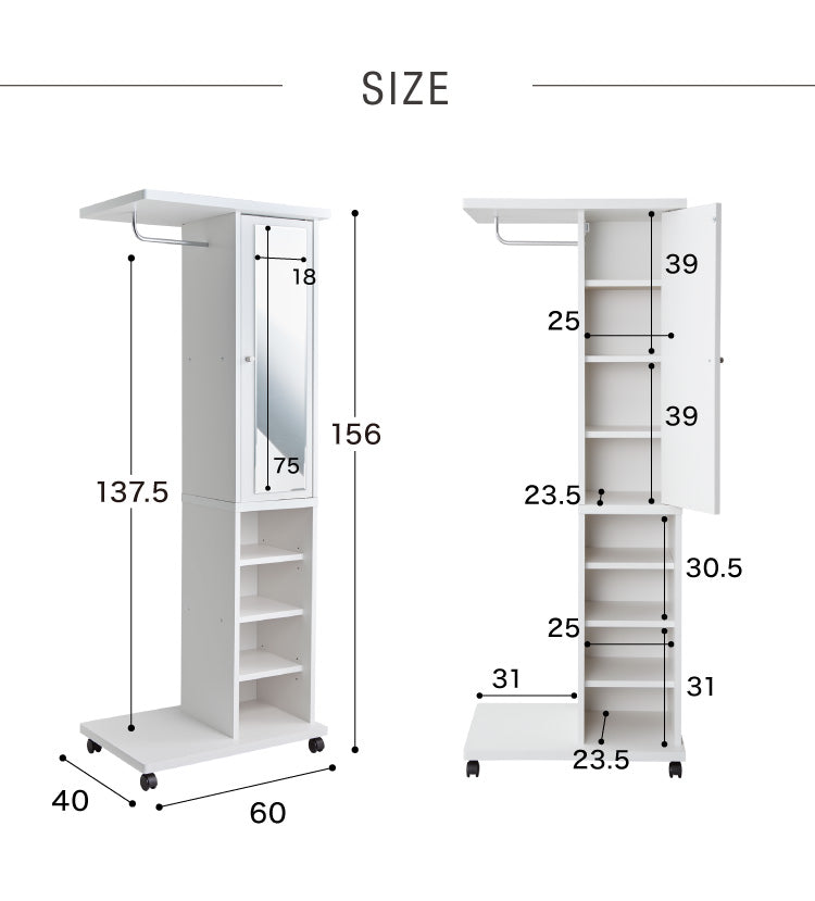 高さ約156cmなので小柄な女性でも天板上へ収納ボックスやカゴが置きやすい設計です。