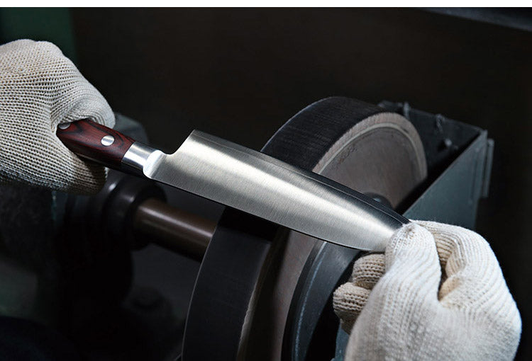 刃の部分には切れ味が長持ちし、錆びにくいモリブデンバナジウム鋼を使用しています。さらに両サイドからステンレスで挟み込んでいるため、より錆びにくく、お手入れが簡単です。ハンドル部分には落ち着いた深みのある赤の積層強化木を採用しました。木のぬくもりが感じられる丸みを帯びたハンドルが手になじみます。口金が付いているので水や雑菌が溜まることを防ぎ、衛生的にお使いいただけます。