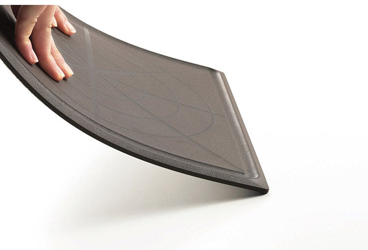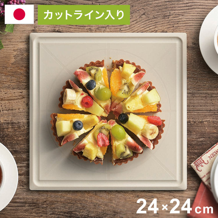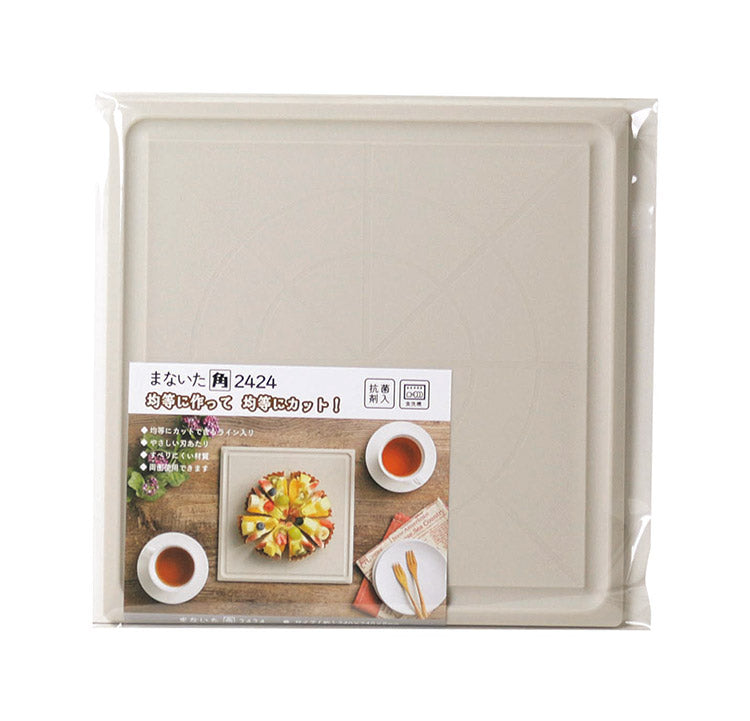 均等にカットできる〇×ライン。均等にカット目盛り付。汁こぼれ防止の溝付き。全周テーパーカットで取りやすい。食卓のお皿としても使用できる正方形形状。安定感がある厚み。