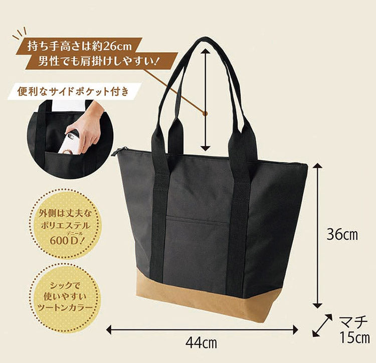 内側には雨具や自転車カバーに使用されている濡れに強いPEVA素材を採用。汚れや結露がサッと拭けるから衛生的に気持ちよく使えます。ファスナーは最後まで隙間なく閉まるこだわり仕様。三層構造で確かな保冷効果と使いやすさを実現。A4ファイルが折れずにしっかり入る!2リットルペットボトルが立てても寝かせてもしっかり入る!持ち手の高さは約26cm!短すぎないから男性でも肩掛けしやすい。