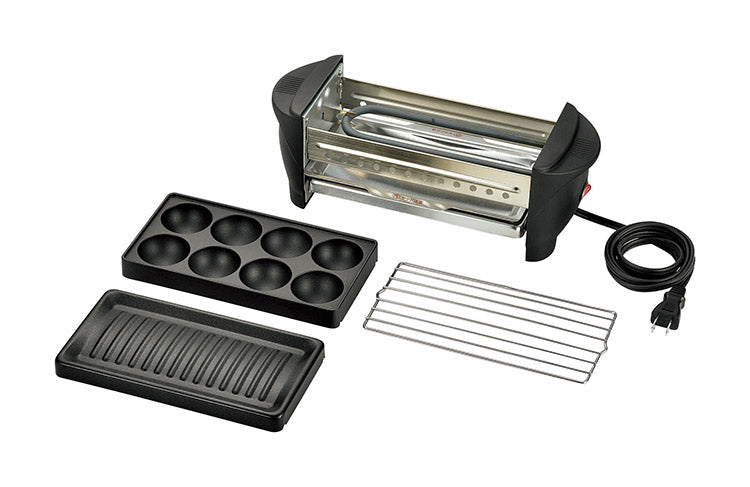 プレート2種類とアミがセットになって、焼き鳥・焼き肉・たこ焼き等の調理ができます。卓上で調理しながらあつあつを楽しめます。プレートは着脱式でお手入れ簡単!