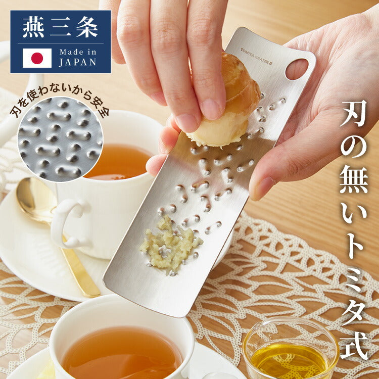 50年以上の歴史を持つ金属加工会社トミタが作る、刃を使わない「トミタ式おろし金」。刃がないからすりおろしのときに手を切らず安心、安全。にんにくなど小さな食材も最後まで擦り切れて、目詰まりをとるスクレーパーも必要ありません。洗う時のスポンジも引っかからずお手入れ簡単