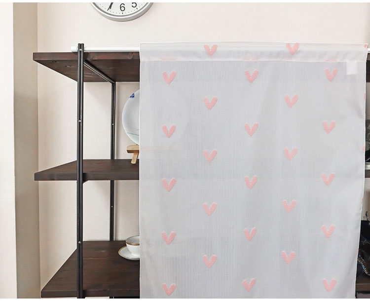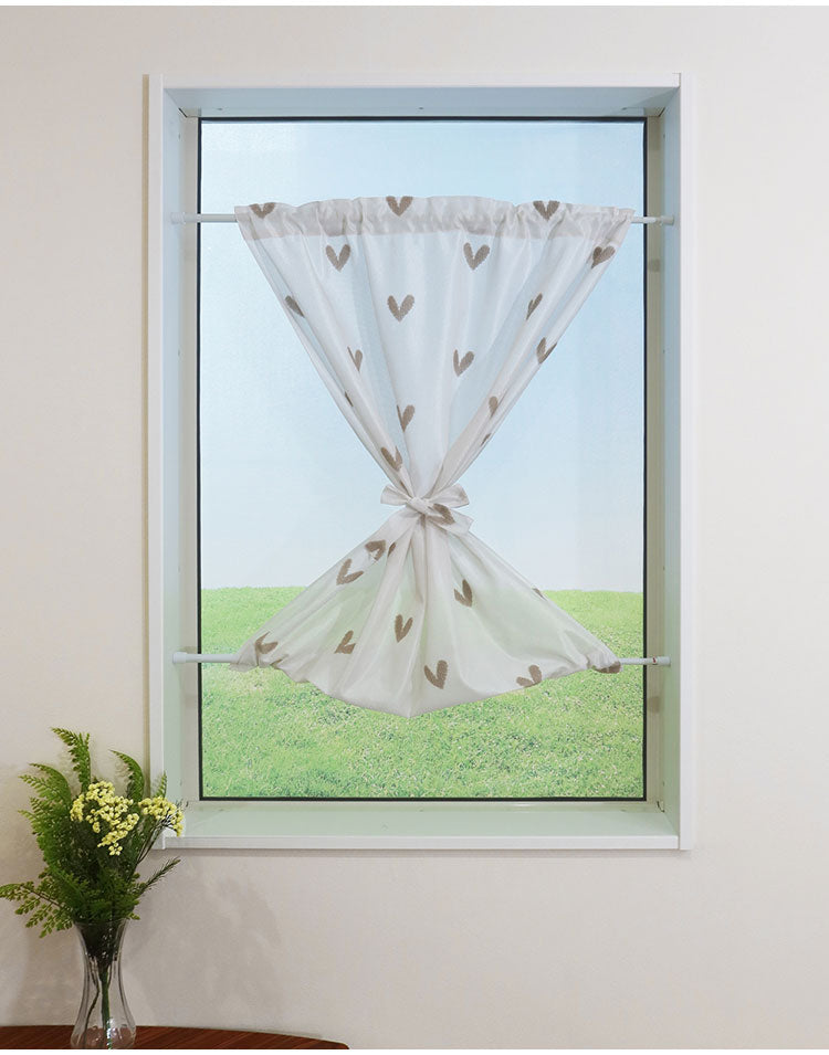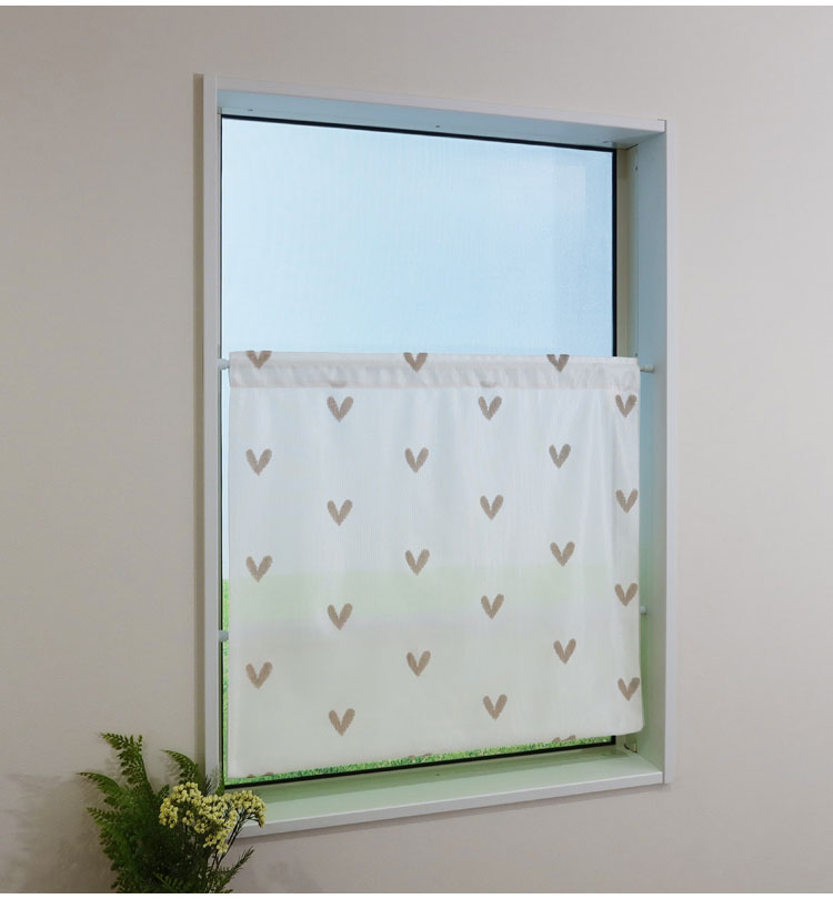 日本製 小窓レースカーテン 約巾70cm×丈90cm 小窓 出窓 カフェカーテン 遮熱 断熱 UVカット 目隠し 北欧調 ハート柄 人気 エコリエ(R) 小窓用ミラーレースカーテン 共生地リボン付き キッチン トイレ(代引不可)
