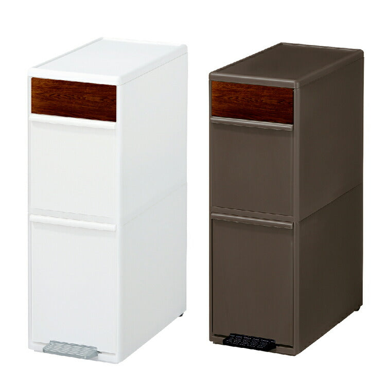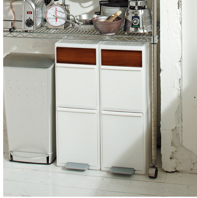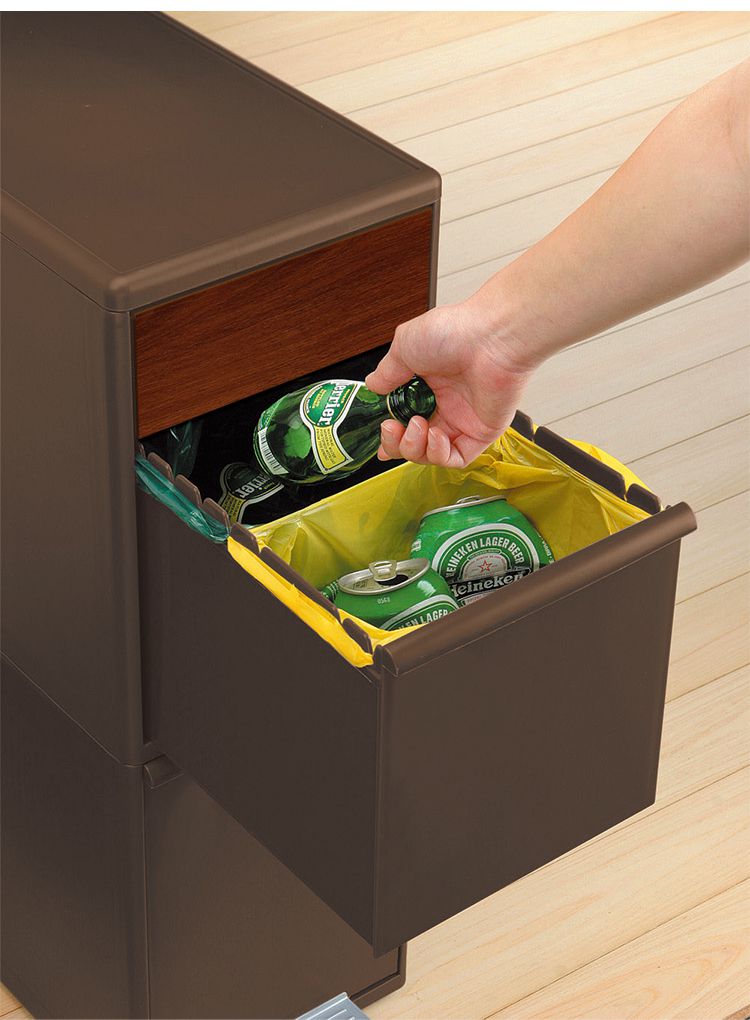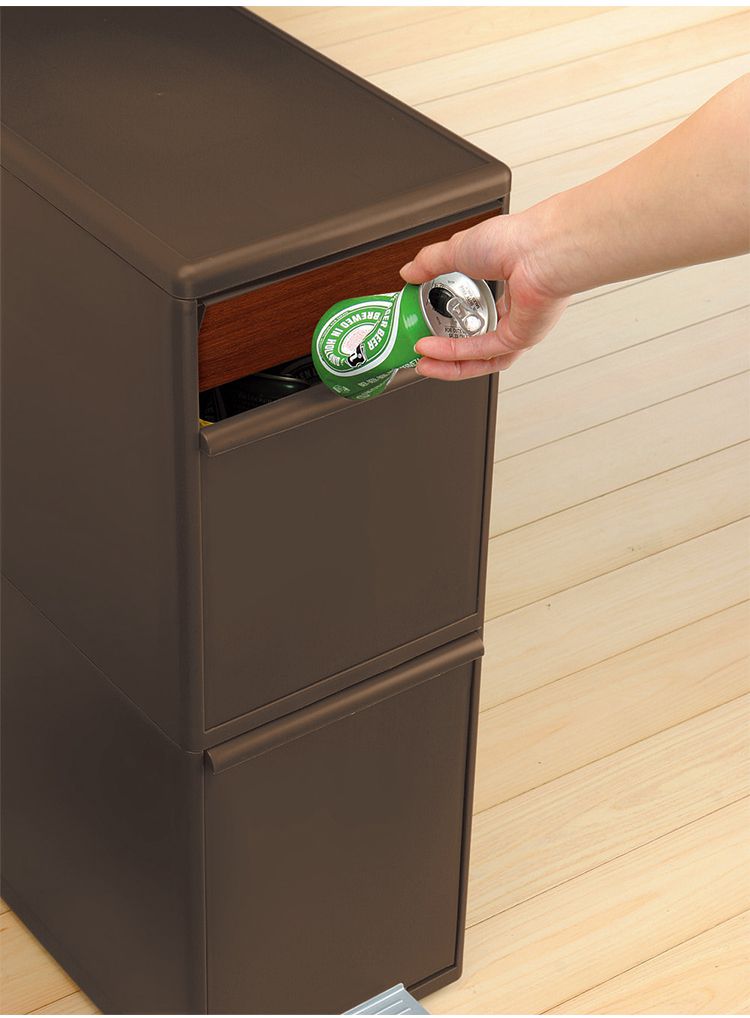 引出し内部の左右の切込みにスーパーなどの取っ手付きポリ袋をセットするだけで簡単に多種分別が行なえます(3‐4分別対応)。上段のスイングパネル付き引出しには、使用頻度の高い資源ゴミを簡単に投入。下段は足で踏めば開閉するペダル式なので、かがまずラクにゴミを投入できます。木目調のスイングパネルがインテリアに馴染むストッカーです