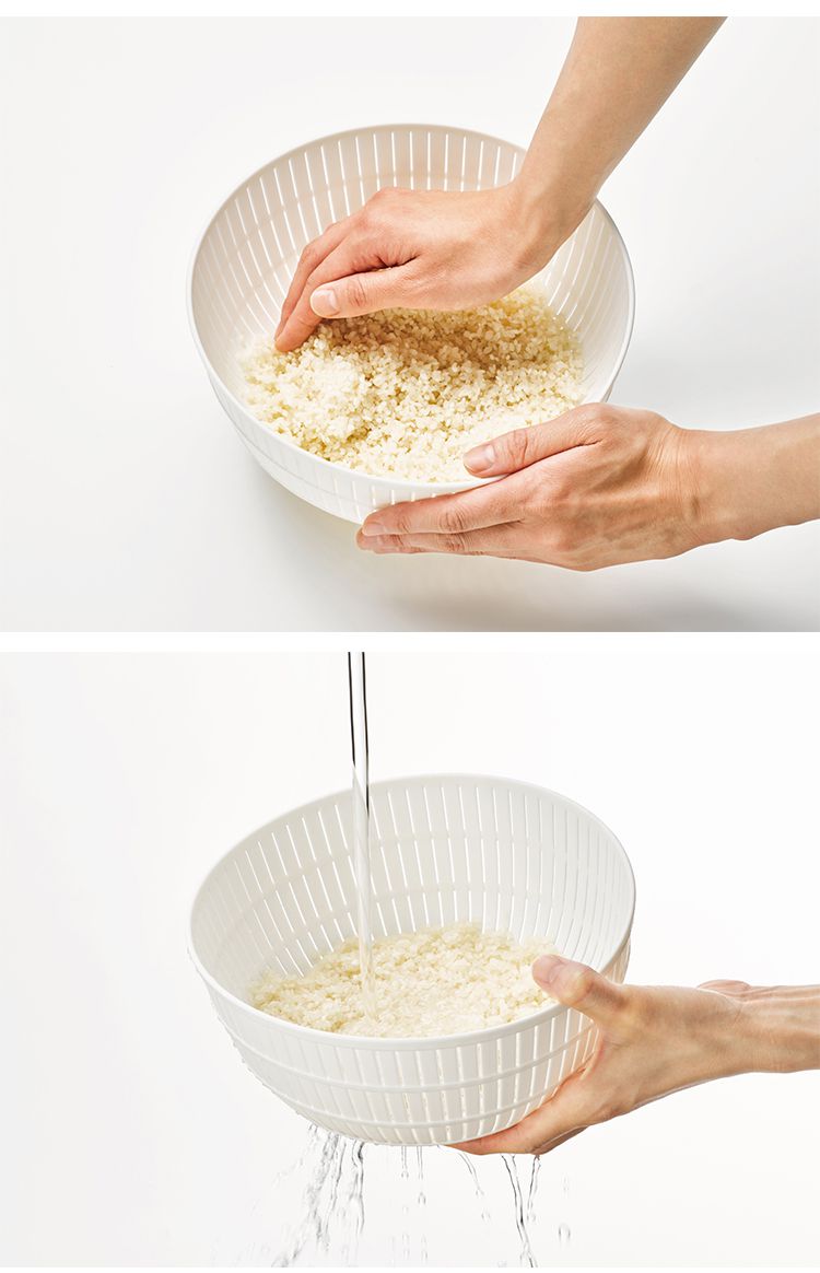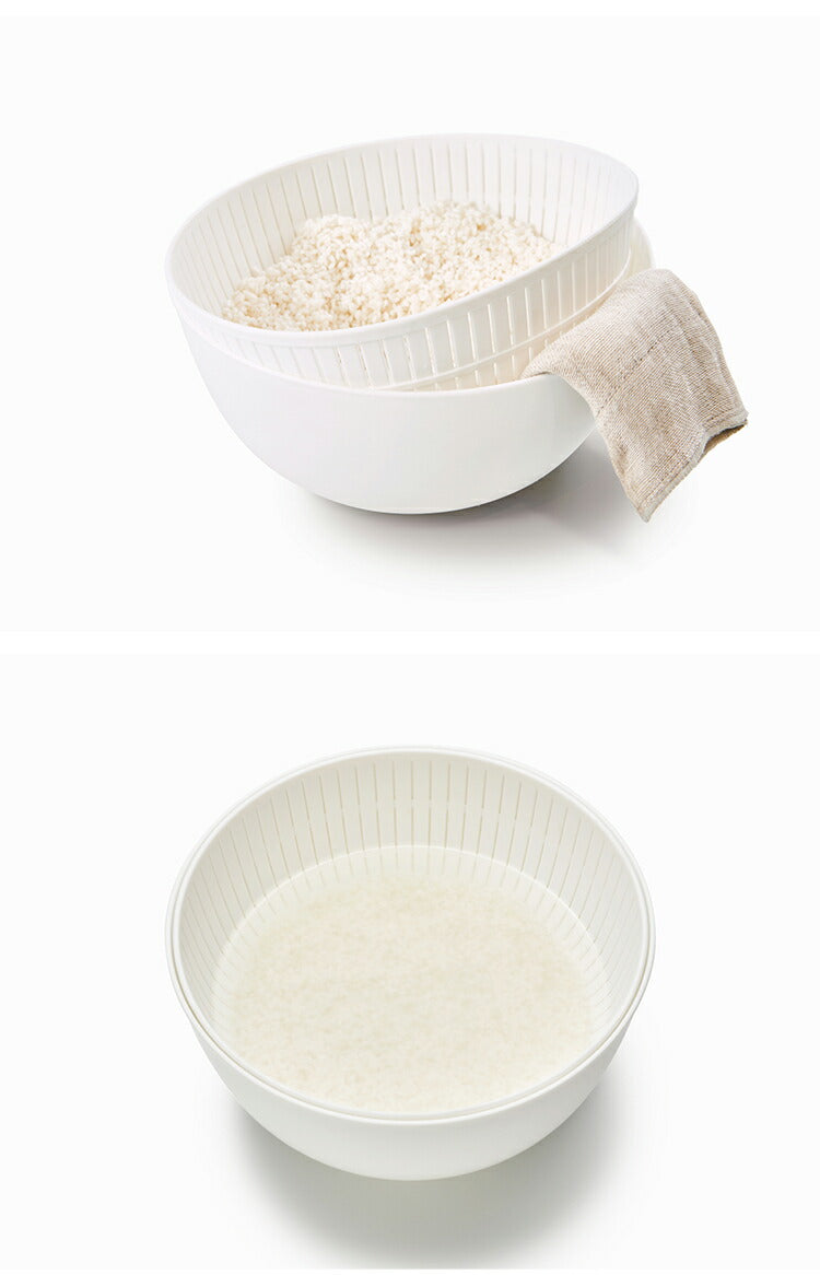 水切れもよくヌカや胚芽を流れ落とすザルに、お米をとぐうえで使いやすく設計された23cmのボウルがセットに。