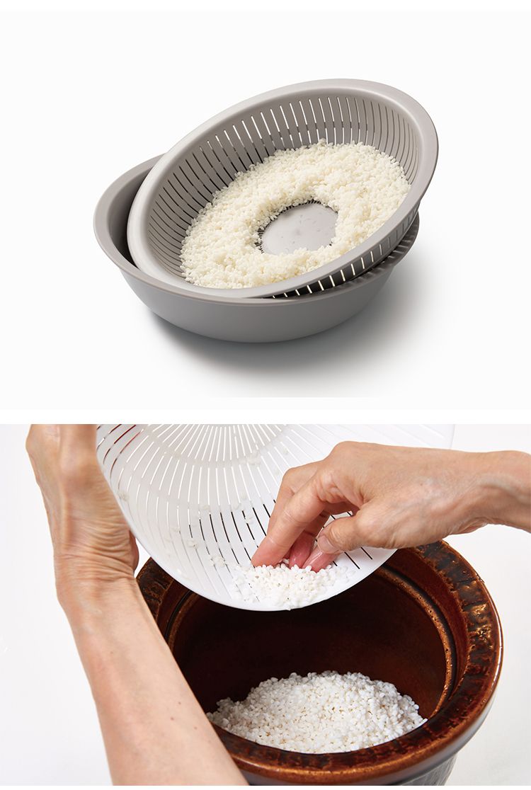 ザルは米をとぐ手の動きに合わせた形で使いやすい直径は23cm。