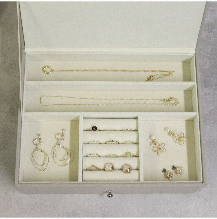 上段収納はさまざまな区分けがされており、リングやネックレスなどの収納に適しております。