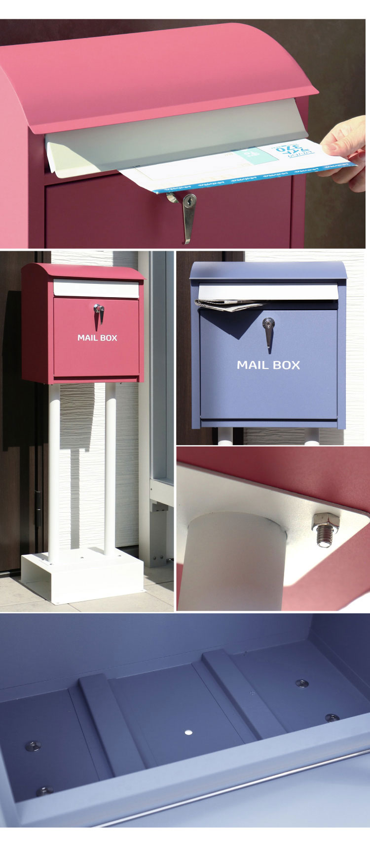 地面固定用のアンカーボルトが付属します。土台部にアンカーボルトを打ち込む穴があり、地面とポストを固定することも可能です。