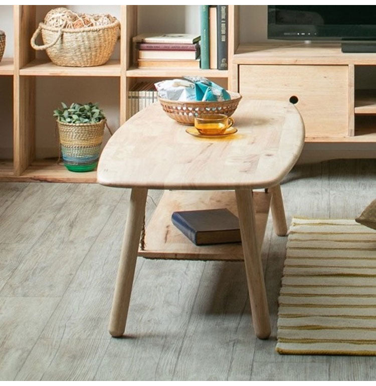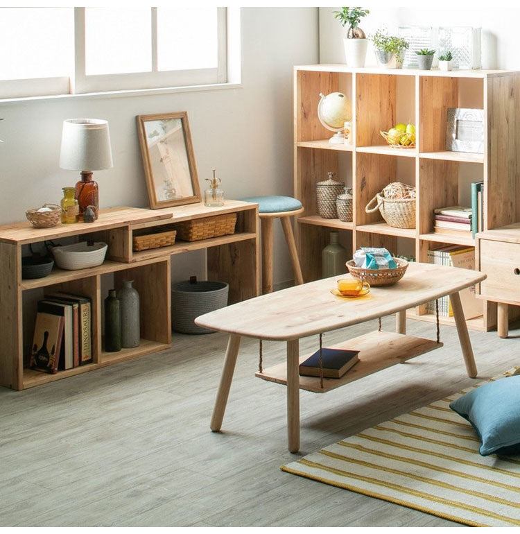 ゆらゆらと揺れる棚板が特徴のローテーブル。リモコンや本など、いつも使うものをしまえます。