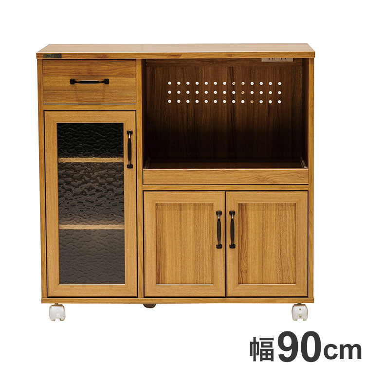 キッチンカウンター 幅90cm カントリー調 レンジ台 キャスター付き 炊飯器 モダン 木目調 シンプル ガラス調 扉 引き出し おしゃれ 北欧 かわいい 新生活 一人暮らし(代引不可)