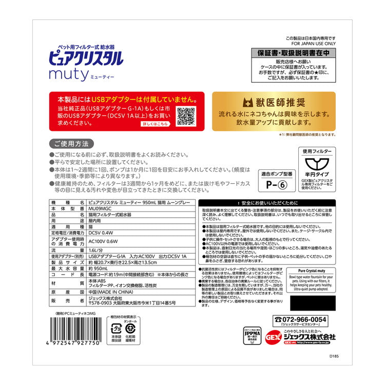 ジェックス ピュアクリスタル ミューティー 950mL 猫用 ムーングレー ペット用給水器 給水機 水飲み器 水飲み 自動 給水器 USB 静音 静か ペット用 猫 GEX