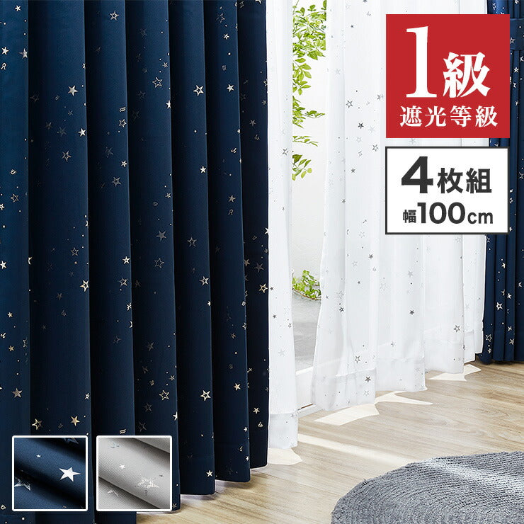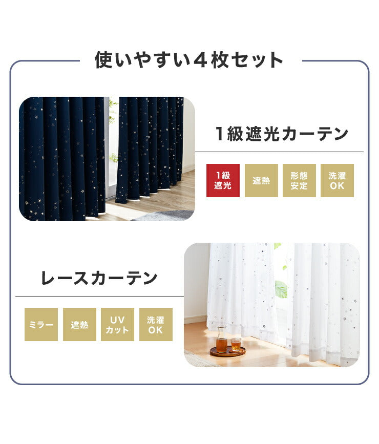 4枚組 星柄カーテン ミラーレースカーテン 【 2カラー × 5サイズ × 4枚組 】 1級遮光 遮熱 形態安定 ウォッシャブル 洗濯可(代引不可)