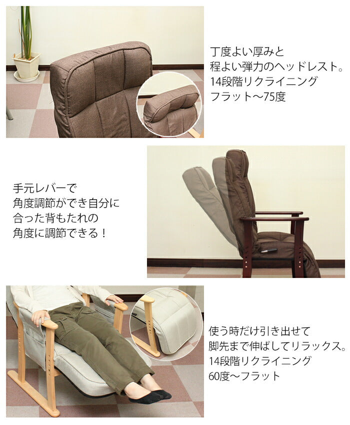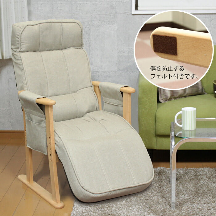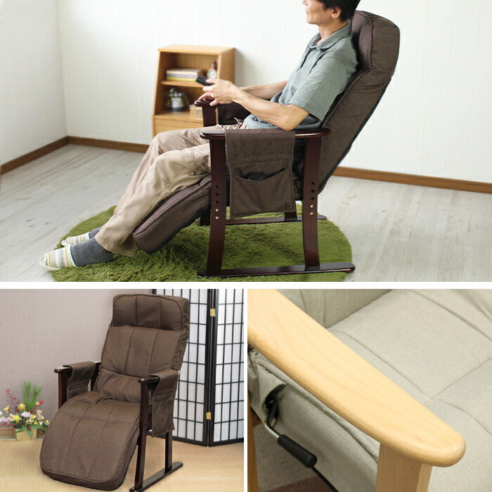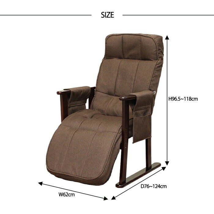 座面4段階調節、背もたれ:無段階レバー式、ヘッド部・フット部:各14段階リクライニング、左右のポケットには新聞や眼鏡・リモコンなどの小物が収納できるので手の届くところにまとめられて便利。座面の高さ調整に加え、ヘッド部・フット部がリクライニングし背もたれは無段階で調節できます。