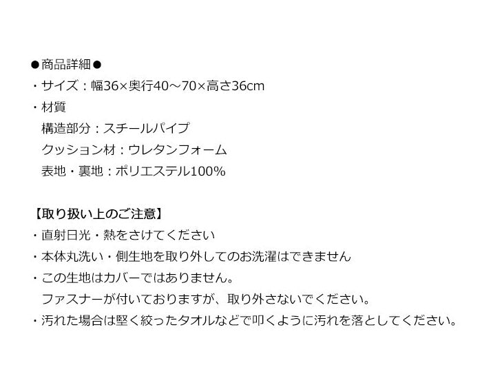 構造部分:スチールパイプ・クッション材:ウレタンフォーム・表地・裏地:ポリエステル100%