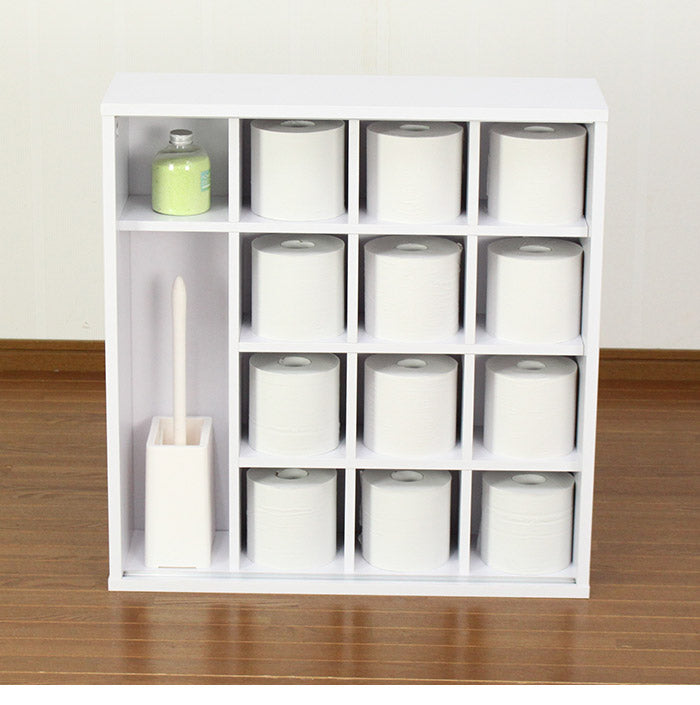 シンプルなデザインのトイレ収納庫。トイレットペーパーを12+1ロールと掃除用具を収納できます。キズ・汚れに強いメラミン化粧繊維板を使用しています。