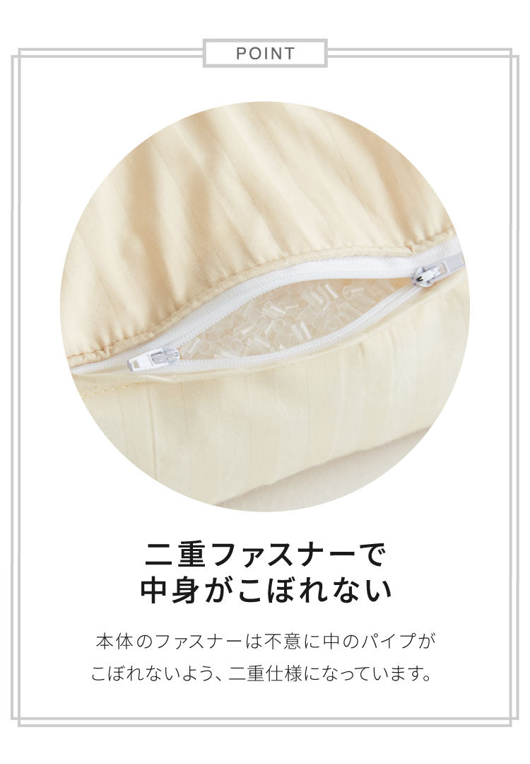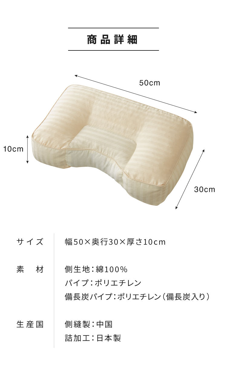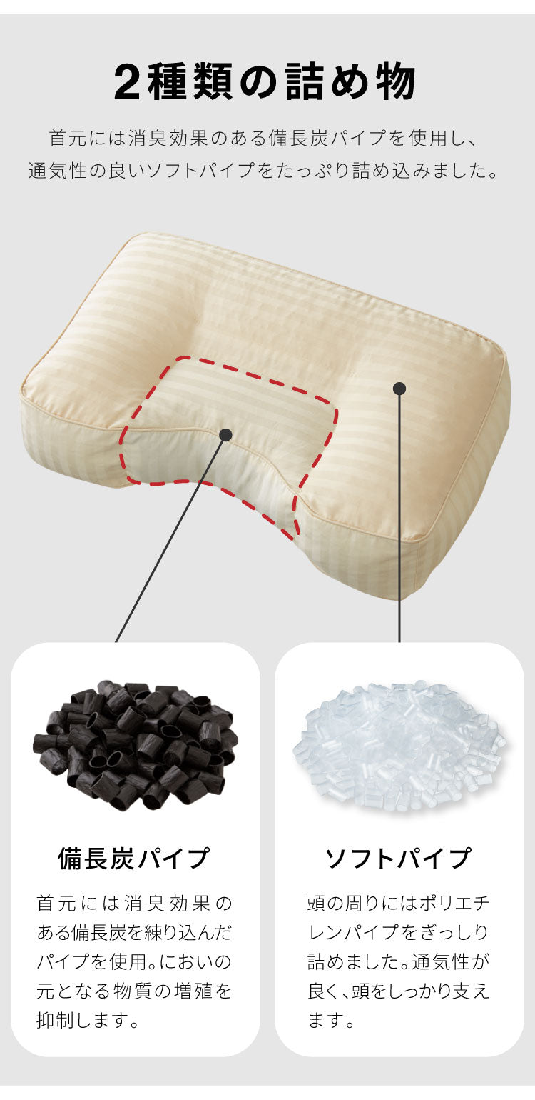 首元を支える部分は、備長炭パイプを使っており、消臭効果があります。またその部分は高さが崩れないように加工しているため、長く使っていただけます。