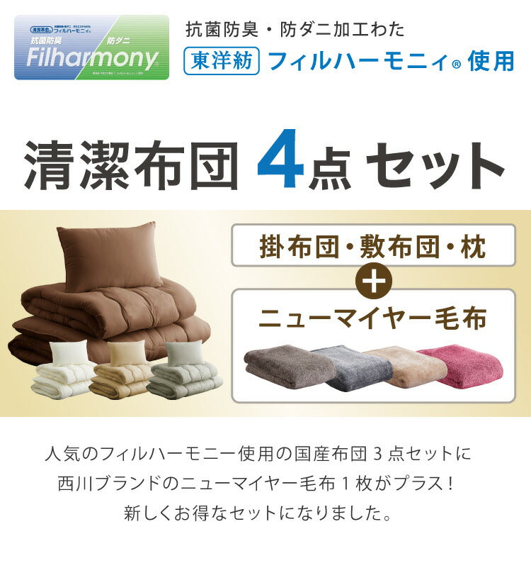 国産 布団セット シングル 西川毛布 防ダニ 抗菌 防臭 ふとん4点セット 東洋紡フィルハーモニー 枕 掛け布団 敷布団 シングルロング ふとん 清潔 洗える ウォッシャブル 新生活 日本製(代引不可)