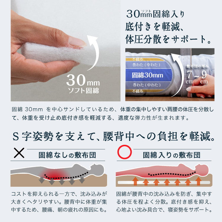 詰め物 【掛け】中空ポリエステル綿100%(1.8kg) 【敷き】巻き綿:中空ポリエステル綿100%(1.8kg) 固綿:ポリエステル100%(1.2kg) 【枕】中空ポリエステル綿100%(0.5kg)