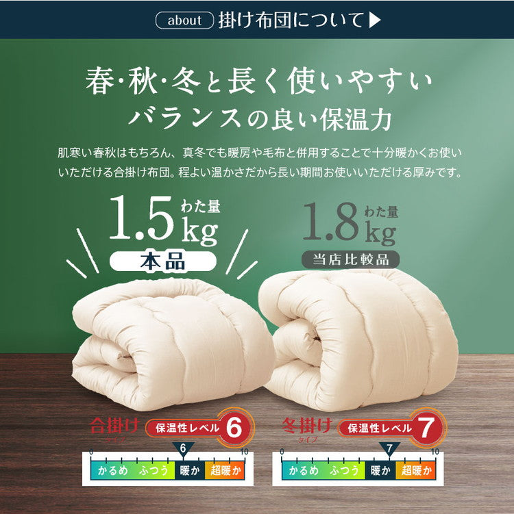 詰め物 【掛け】中空ポリエステル綿100%(1.5kg) 【敷き】巻き綿:中空ポリエステル綿100%(1.5kg) 固綿:ポリエステル100%(1.0kg/3cm厚) 【枕】中空ポリエステル綿100%