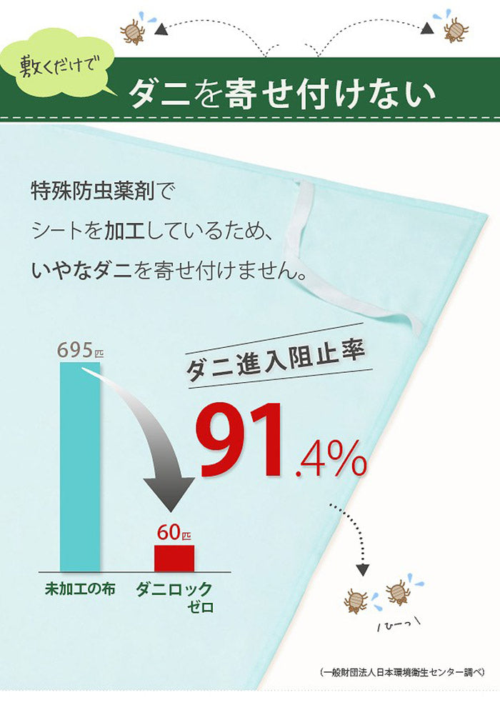 商品について:イヤなダニを寄せ付けない特殊加工をした防ダニシートSサイズ。布団やマットレスの下に敷くだけで防ダニ効果があります。寝具は洗えなかったり、頻繁に洗濯することが大変!ダニロックはシートタイプなので簡単。ご家庭の洗濯機(ネット使用)で洗って繰り返しお使いいただけます。忌避効果は洗濯10回以上持続します。