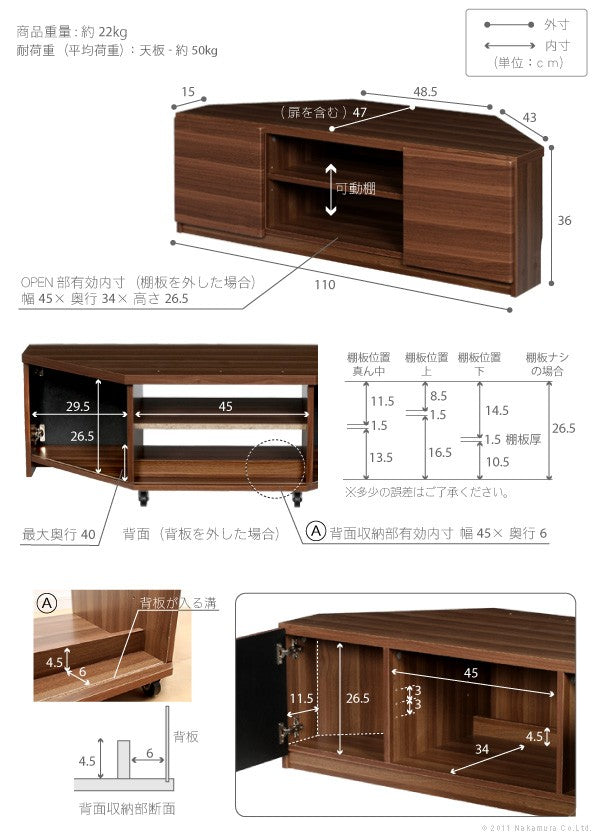 | 商品について | 背面収納タイプのコーナーTVボード。テレビをコーナーに置くことで部屋のスペースを有効利用でき、部屋中どこからでも見やすい。背面にテーブルタップを収納できるのでコード類の扱いも簡単。前後に動くキャスター付きで配線作業、お掃除はラクラク。天板耐荷重50kg、テレビサイズ目安37V型まで サイズ(cm):幅110x奥行47x高さ36・約22kg カラー:ホワイト(前板鏡面タイプ)・ブラック(前板鏡面タイプ)・ウォールナット 材質:本体-プリント紙化粧パーティクルボード(木目タイプ)、前板-合成樹脂化粧繊維板 組立品 |