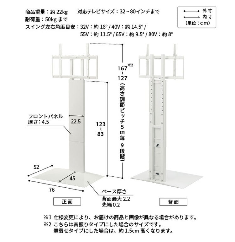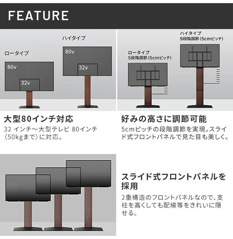 テレビスタンド TV台 ハイタイプ 32~80v対応 ホワイト 白 ブラック 黒 ウォールナット ブラウン ナチュラル テレビ台 スタイリッシュ 幅76cm 奥行52cm 高さ127~167cm(代引不可)