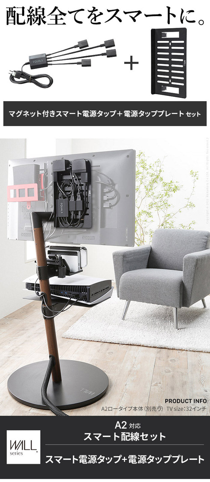 WALLインテリアテレビスタンド A2対応 スマート配線セット スマート電源タップ 電源タッププレート ケーブル収納 コード収納 背面収納 整理 配線整理 ブラック スチール製 延長コード セット(代引不可)