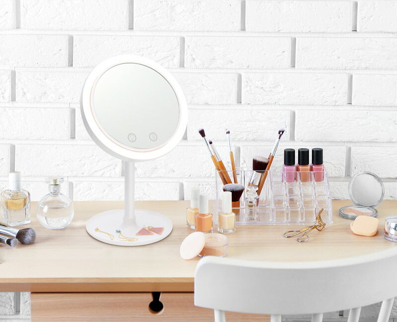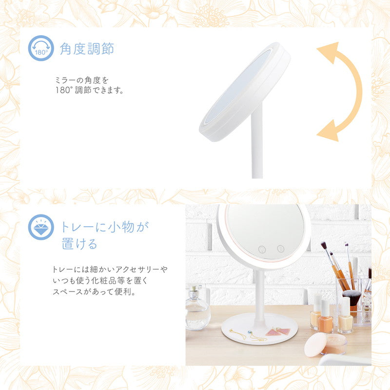 メイクミラー ファン付き LEDライト付き USB充電 北欧 おしゃれ 快適メイク スキンケア 無段階調光式 小物置き トレイ 角度調整 180° LEDメイクミラー スタンドミラー MEBL-109